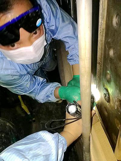 時間一分一秒過去了,一晃到了晚上。“捐贈藥品生產是公司當前的頭等大事,時間耽誤不起,不能等了”。車間組織維修工骨干連夜攻關。在家輪休的維修工肖世建師傅星夜馳援。他是“黃金山工匠”,技能過硬。肖師傅趴在狹小的空間里,一干就是6個小時,第二天凌晨4點終于將破裂的加熱板焊補完成,問題解決,大家都松了一口氣,擊掌慶祝,也都忘了通宵達旦的疲憊,繼續進入工作崗位。2月3日上午8時,設備經過清洗、消毒,恢復了正常運行。