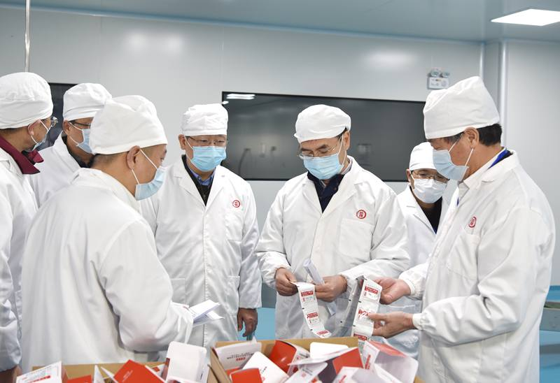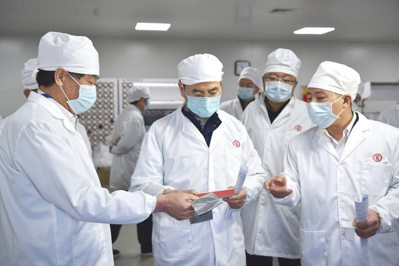 惠建林一行先后參觀了勁牌持正堂藥業國醫館、檢測實驗室、中藥提取一車間、中藥配方顆粒智慧藥房和中藥顆粒劑車間。參觀過程中,惠建林詳細詢問了用于新冠肺炎的中藥預防二號方、“清肺排毒湯”和“肺炎1號”治療方的生產情況,并對藥品配方、藥材檢測、生產設備、工藝流程等進行了深入了解。